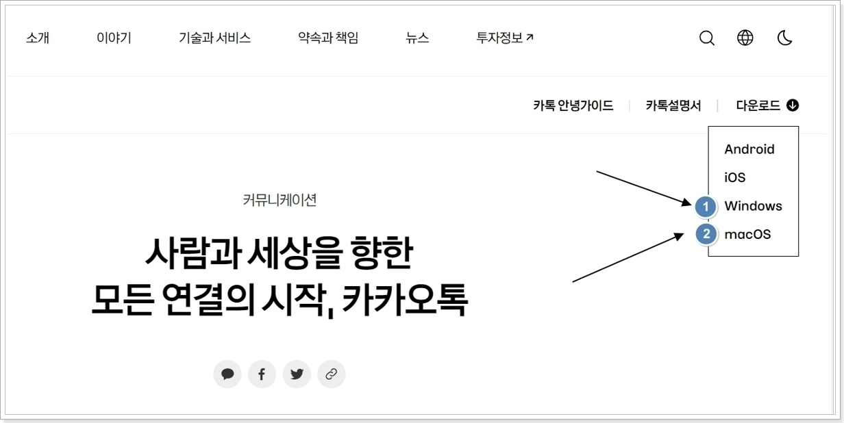 가장 먼저 해야 할 일은 카카오톡 공식 사이트에 접속해서 설치 파일을 받는 일이에요. 윈도우용, 맥용 각각 준비돼 있어서 본인 운영체제에 맞는 걸 고르면 돼요.