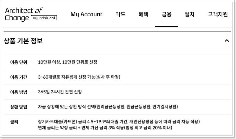 현대카드 카드론 대출조건을 간단히 정리하자면, 10만 원 단위로 신청 가능하고 기간은 3개월부터 60개월까지 설정 가능해요. 이용 방법도 365일 24시간 가능하니까 편리하게 사용할 수 있고요.