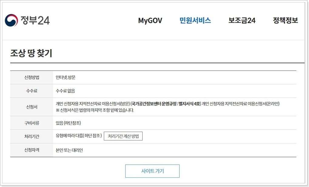 정부24에 접속해서 ‘조상 땅 찾기’를 검색하면 관련 민원 메뉴가 나와요. 공동인증서로 로그인 후, 사망자의 정보와 본인의 정보를 입력하고 신청서와 첨부 서류를 함께 제출하면 돼요. 빠르면 며칠 안에 결과가 나오는 경우도 있어요.
