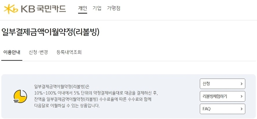 신청은 국민카드 홈페이지나 앱에서 몇 번의 클릭만으로 가능해요. 로그인 후 ‘리볼빙’ 메뉴를 찾아서 이용 신청을 누르면 되는데요. 상담원 연결 없이도 셀프 등록이 가능해서 편하더라구요.